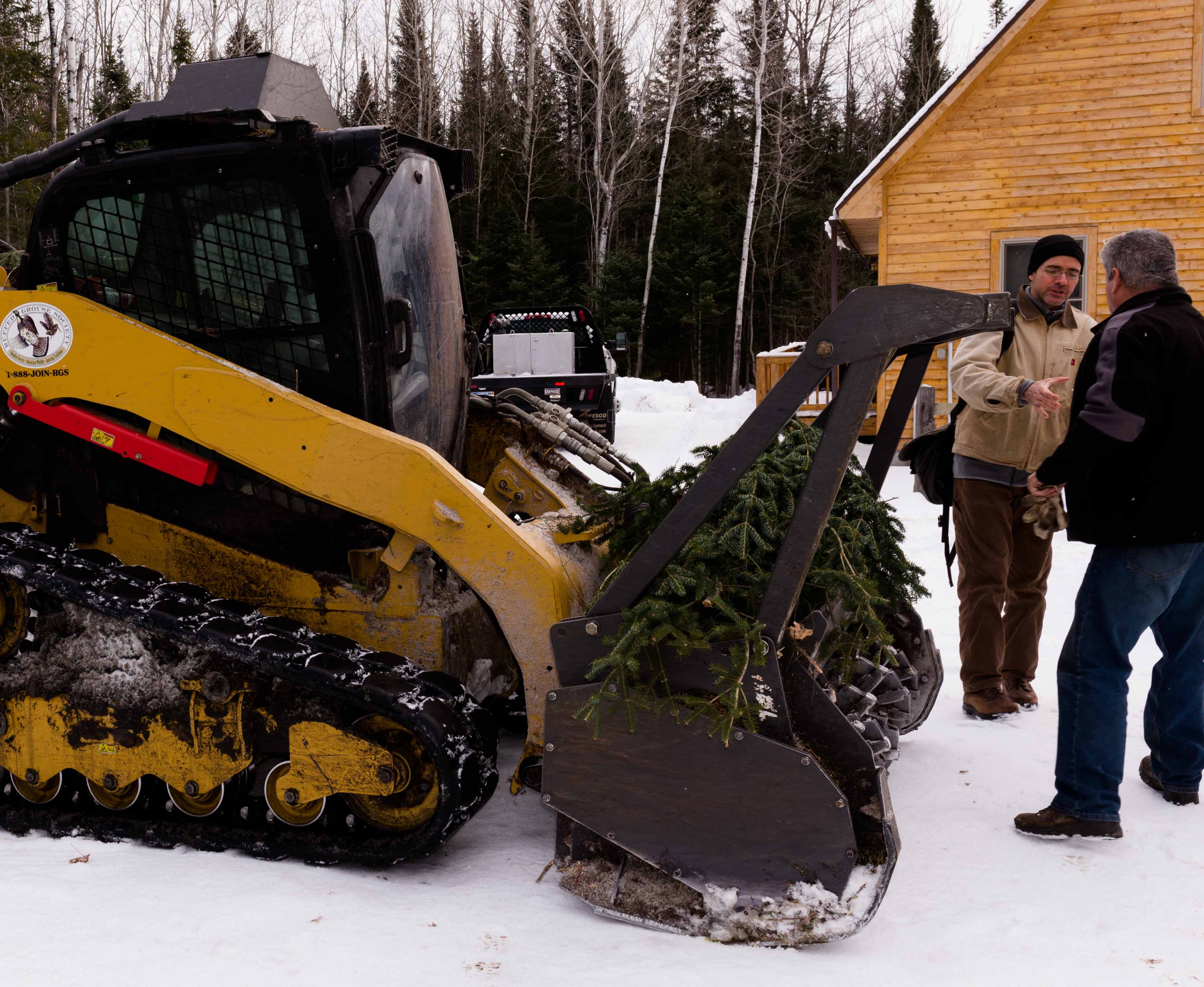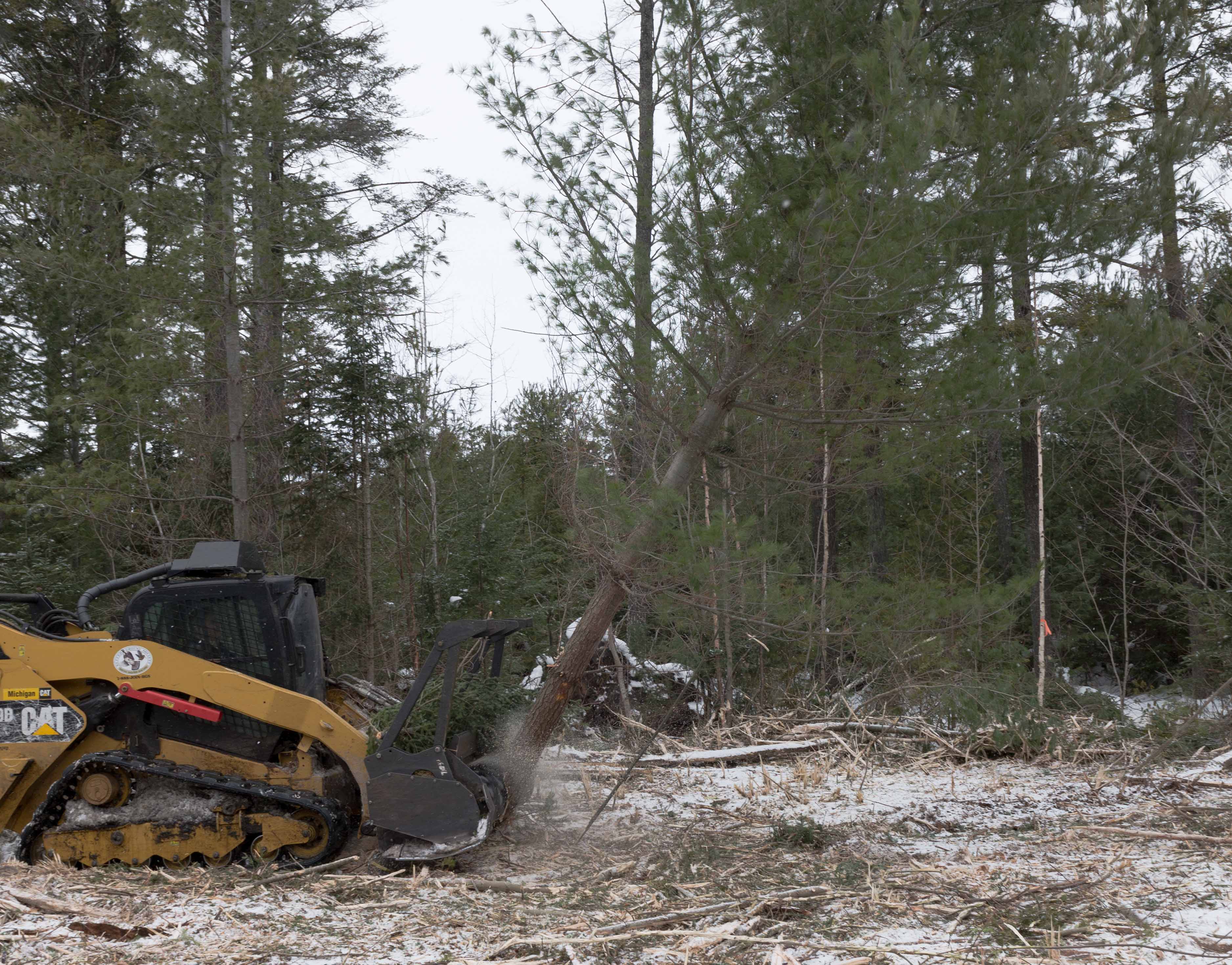As the pictures suggest, this requires some heavy equipment. What the Ruffed Grouse Society has called their Habitat Machine is designed to take down most of the smaller trees and shrubs, turning them into a woody mulch. The bulldozer-like machine has a whirling drum of big metal teeth mounted on the front that grinds down everything in its path. The sound is deafening.
