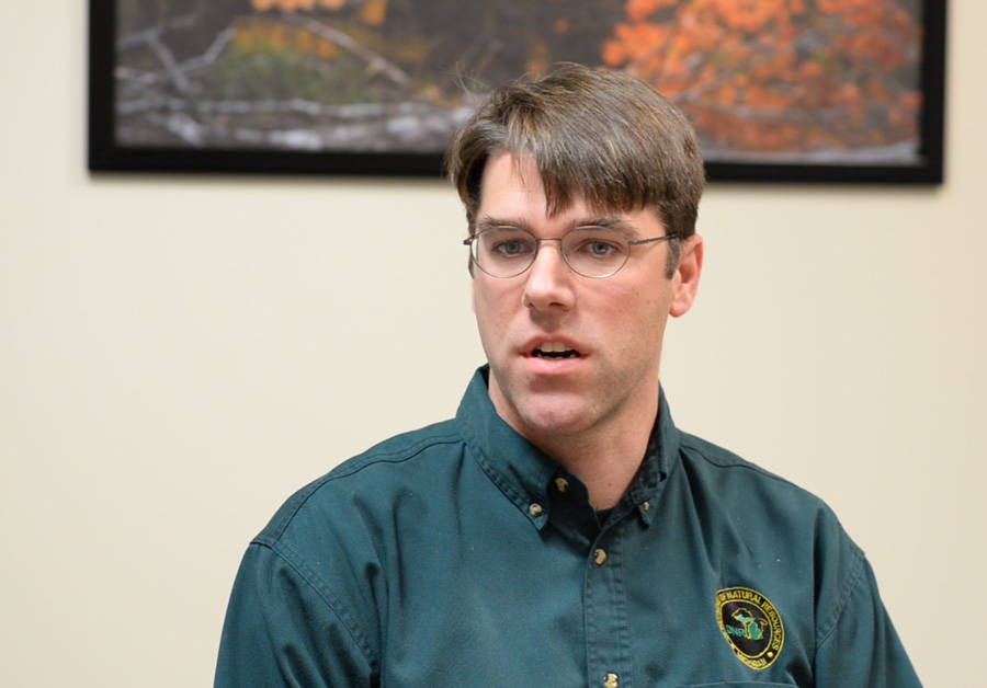Working with a number of different experts in the DNR and the Michigan Natural Features Inventory (http://mnfi.anr.msu.edu/), Chris helped to characterize the vulnerability of individual wildlife species to the various impacts of climate changes now overtaking Michigan. The methodology for this assessment was provided by NatureServe, a respected conservation science group with many partners. In general, vulnerability can be seen as a combination of a creature’s sensitivity to changes in a specific environmental factor such as heat together with that creature’s ability to avoid exposure to unacceptable factors, such as moving to cooler locations. Other vulnerabilities arise when sources of food and shelter change or are lost as climates shift. Ultimately Chris and his colleagues pulled together the information and completed climate change vulnerability assessments on 400 of Michigan’s wildlife species. As Chris describes in the first video segment, the DNR’s vulnerability assessment addresses the risks of population decline by mid-century due to changes in Michigan’s climate. Given the amount of carbon dioxide already in our atmosphere, there will be a 5 degree Fahrenheit increase in average temperatures and a drying of many soils across Michigan by mid-century. The vulnerability assessment shows that many our wildlife species will not be able to cope with these changes. VIDEO – SEGMENT 1