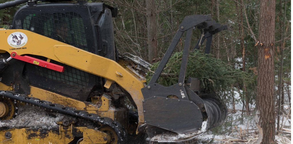 As the pictures suggest, this requires some heavy equipment. What the Ruffed Grouse Society has called their Habitat Machine is designed to take down most of the smaller trees and shrubs, turning them into a woody mulch. The bulldozer-like machine has a whirling drum of big metal teeth mounted on the front that grinds down everything in its path. The sound is deafening.